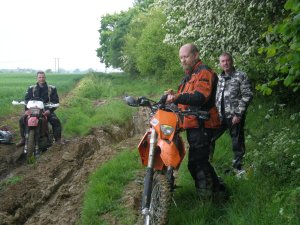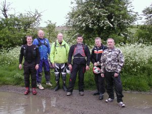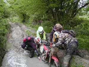 Sure enough he sailed through. All this time I could hear another bike being revved to death further back up the lane, walking back I found Tony stuck as well. I took photos as more and more guys got stuck in trying to get the bike out until I felt I should help a bit so Skid and I grabbled the front end and lifted it into the bank and then the other guys got the back end up. A good workout all round but it wasn’t finished yet!