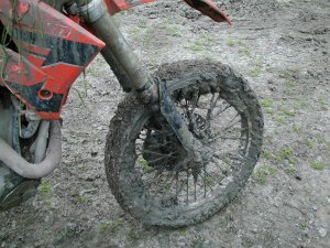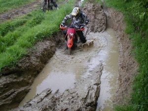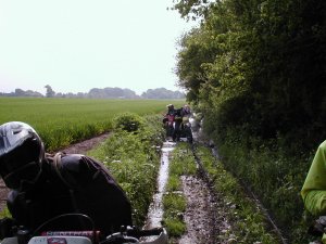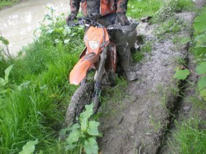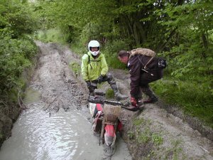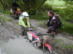 Vid of Ben helping me out the first mud puddle - photobucket is cutting sound off for some reason I asked Zulu if he was keen to carry on in the middle, he agreed that ‘it’s why we are here’ so we ploughed on through the mud until I spotted a massive puddle (lake) up ahead. Again I needed help to get the bike out of the sunken lane and opted to use a rut up on the bank which turned out to be a mistake as this one was also a mud fest. I jumped off the bike and pushed for all I was worth and slowly the bike inched forward with the engine doing a jumbo jet impression. With ten feet left to go it got stuck, and no amount of pulling, pushing and wiggling would move it. Once again the guys came to my rescue and we lifted it out. By this time I was absolutely knackered and covered in clay mud.
