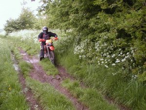 From there we headed ever Westwards on lanes that I’d ridden in the past but never taken the other guys on. Rob took a tumble while negotiating a rutted lane and badly bent his left thumb and he was having trouble using it. After a few miles we crossed a tar road and Rob recognized where he was so he called it a day and limp home trying not to use his hand. Apparently it took 45 minutes for him to get out of his ridding gear as he’s a lefty. At time of writing he is still unable to use it, get well soon mate.
